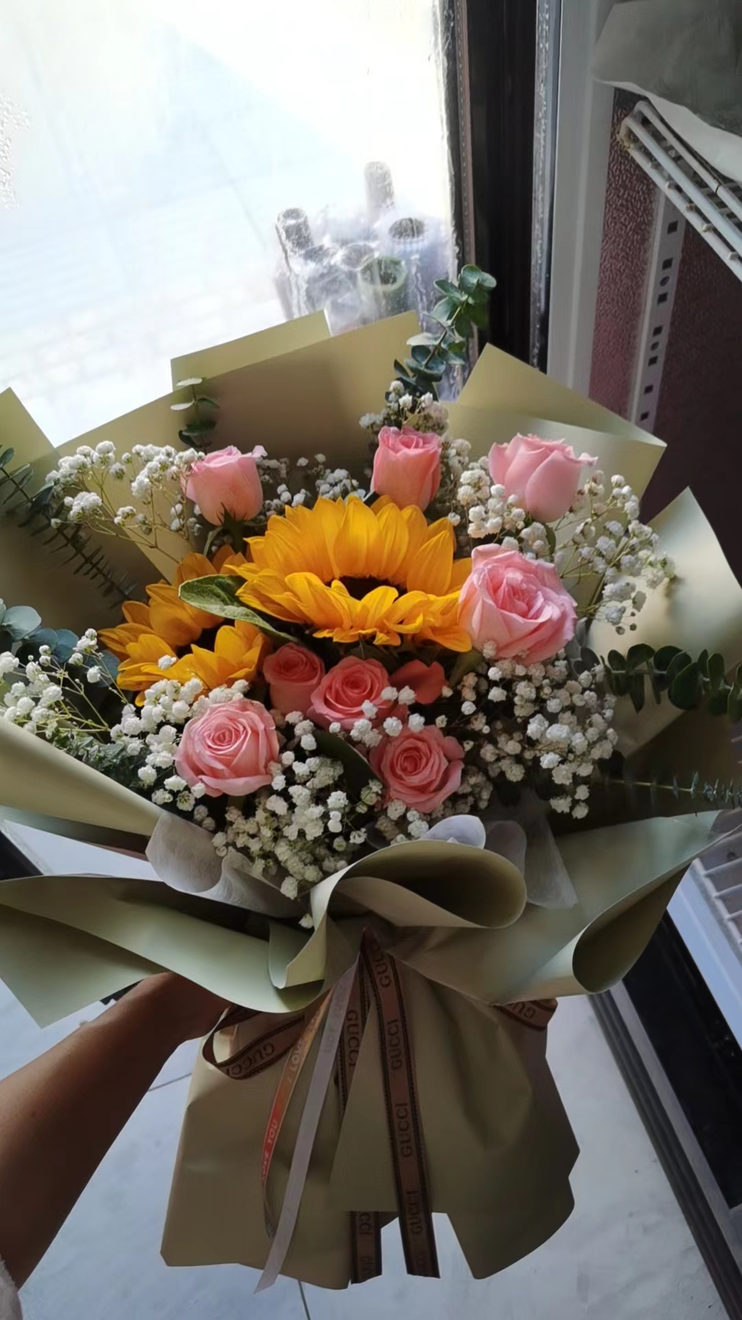 11朵香槟玫瑰2朵向日葵混搭花束 |