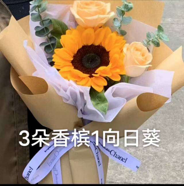3朵香槟加1朵向日葵加尤加利叶花束,共三束 |