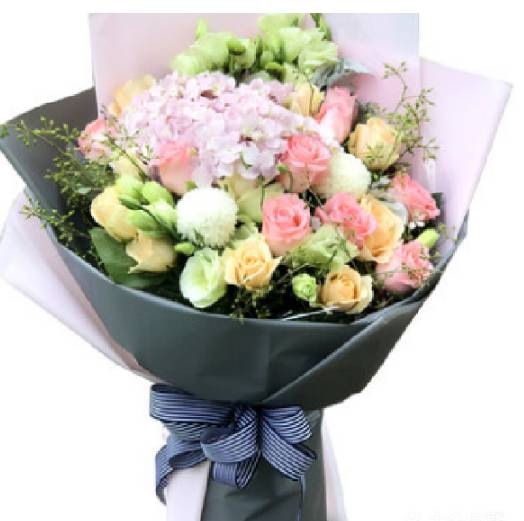 8朵香槟8朵粉玫瑰混搭绣球梗桔花束 款式包装如图 |