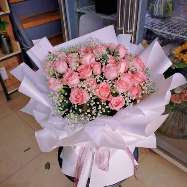 6朵粉玫瑰粉蓝混搭满天星花束 按图包装 |
