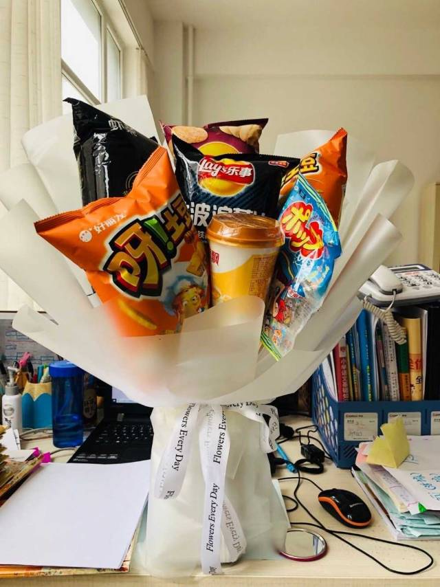 夜上海论坛零食花束(呀!土豆2包,乐事波浪薯片2包,虾条1包,香飘飘奶茶1个,不二家棒棒糖一包,辣条2包,泡椒凤爪2包)如图制作再加点满天星 |