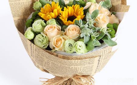 夜上海论坛香槟玫瑰11枝,向日葵2枝,绿色桔梗5枝,绿色小菊3枝,叶上花3枝,如图制作 |