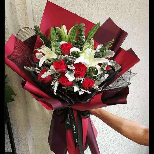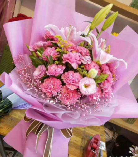 19朵粉康乃馨5朵粉色百合混搭花束 款式包装如图 |