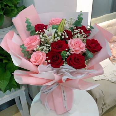 11朵红玫瑰戴安娜粉玫瑰混搭2支百合花束 按图 |