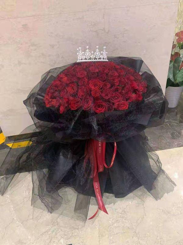 夜上海论坛52朵红玫瑰加皇冠加黑纱加闪灯花束,如图包 |