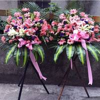 开业花篮2对(4个),每个花篮花材:33朵(玫瑰+百合 +康乃馨)混搭花束花篮 ,如图包装大气 好看 ,有贺词 ,按时送达。