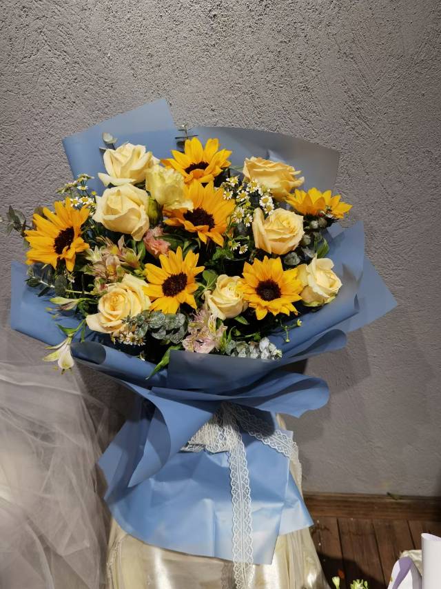 夜上海论坛图1:5朵香槟玫瑰+3朵向日葵花束 数量:1 |