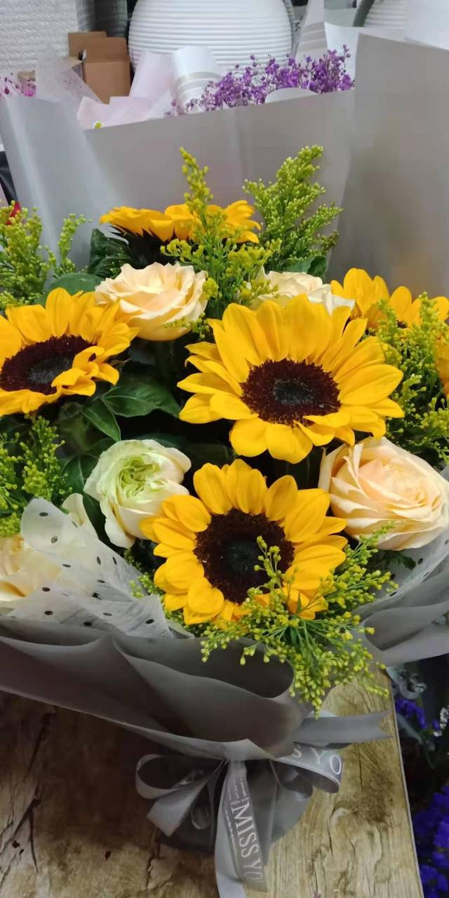 夜上海论坛4朵向葵,6朵香槟混搭花束如图 |