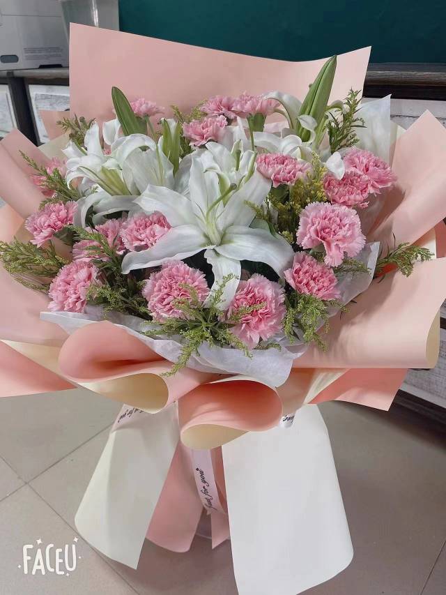 19支粉康乃馨2支白百合配洋桔梗花束,如图 |