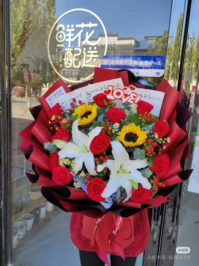 夜上海论坛11支红玫瑰2支白百合2支向日葵花束,如图 |