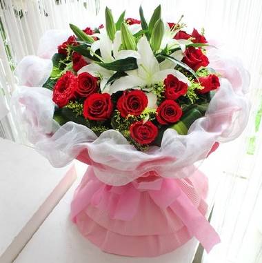 19朵红玫瑰3支百合花束,要用花泥,用第2个图的包装纸 |