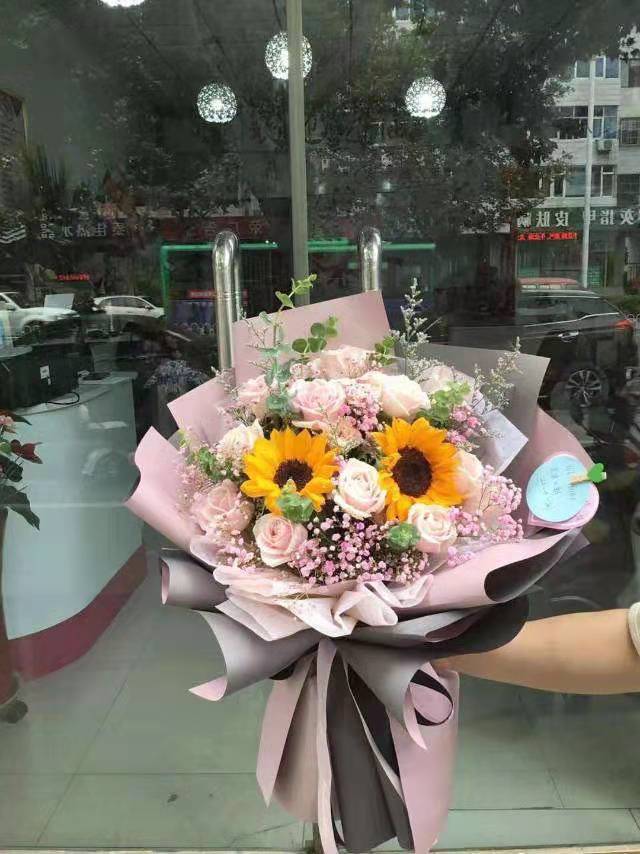 夜上海论坛11支粉玫瑰2向日葵混搭花束,如图包 |