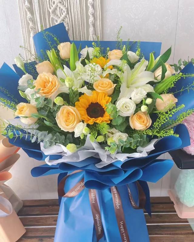 11支香槟玫瑰2支向日葵2支多头白百合搭配白色洋桔梗花束 |