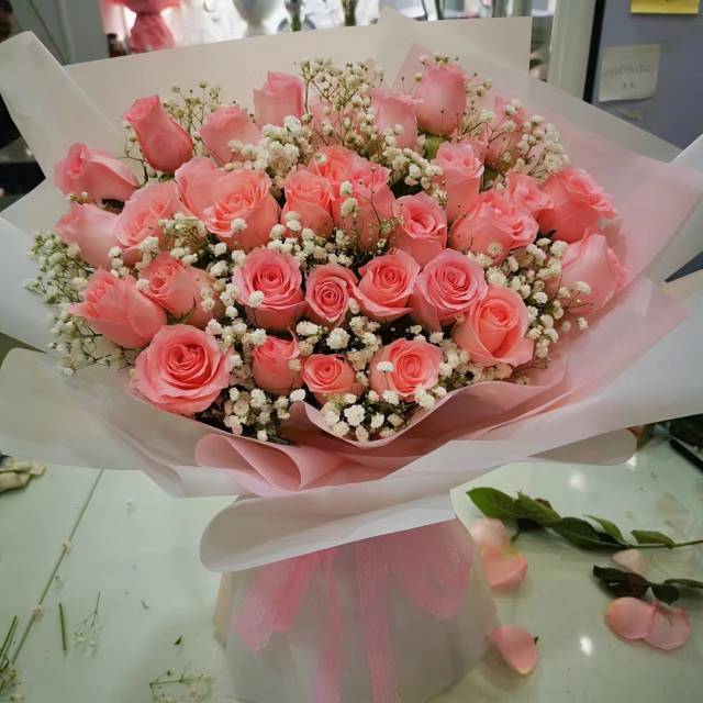 夜上海论坛33支粉玫瑰配满天星花束,按图包 |