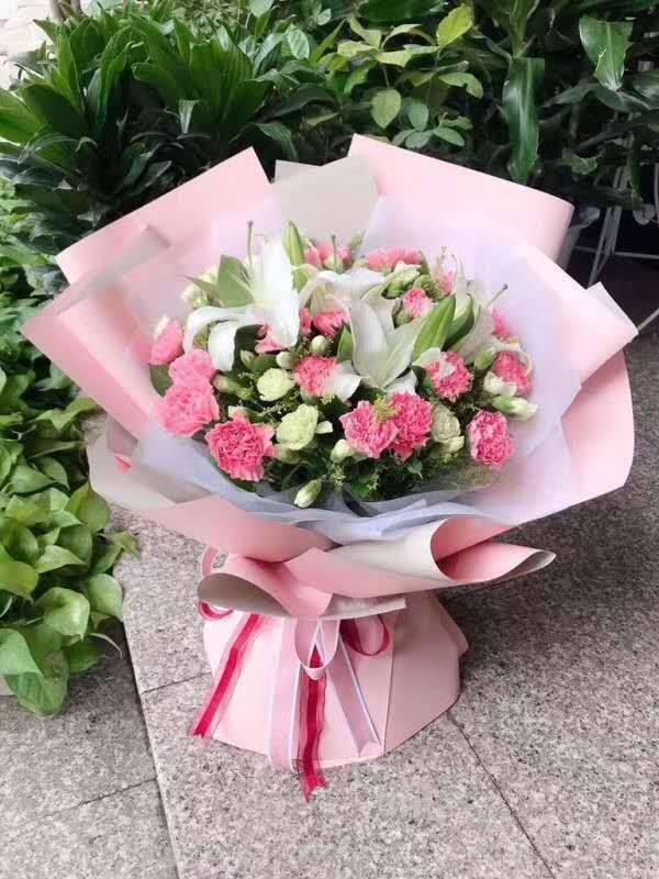 11支粉康乃馨2支多头白百合花束,如图 |