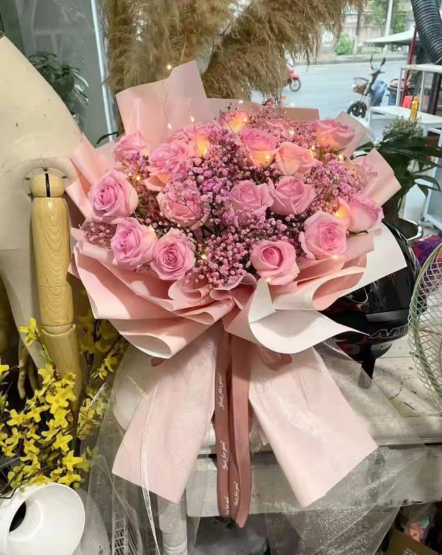 33支粉玫瑰配粉色满天星花束加灯,如图 |