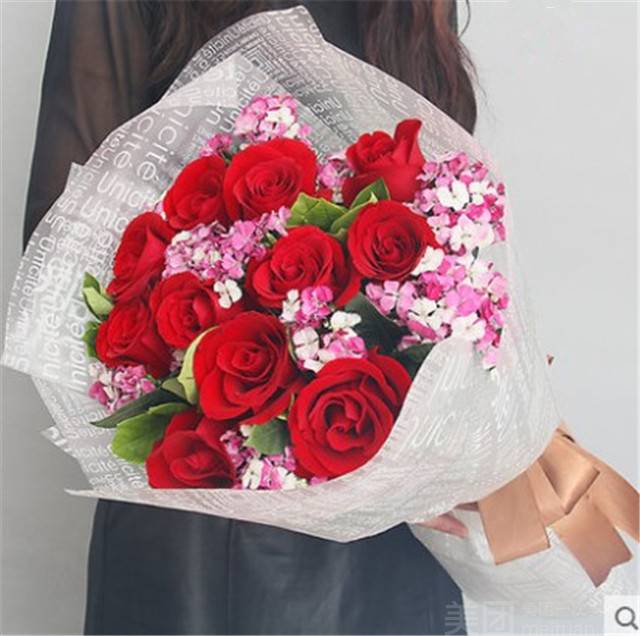 街道地址: 9朵粉玫瑰满天星花束 如图 |