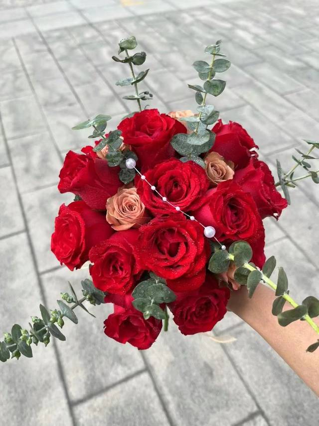 15支红玫瑰+4支卡布奇诺新娘手捧花,如图(带珍珠串) |