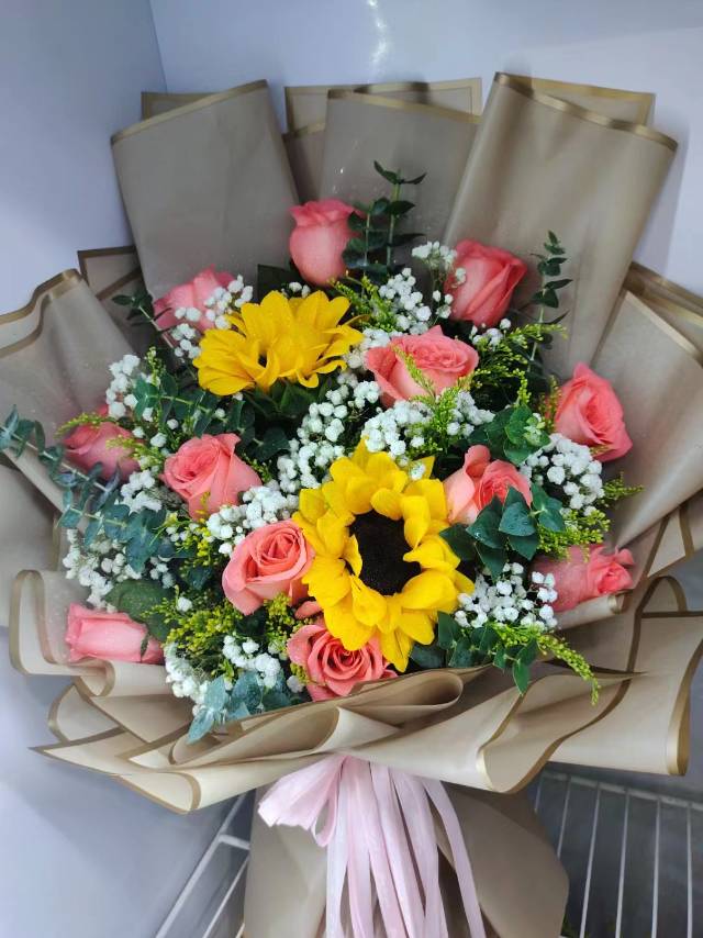 夜上海论坛12支粉玫2支向日葵混搭花束,按图做 |