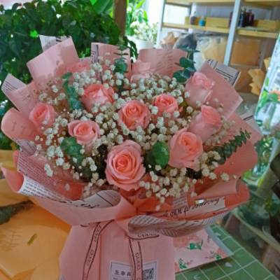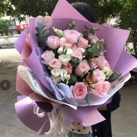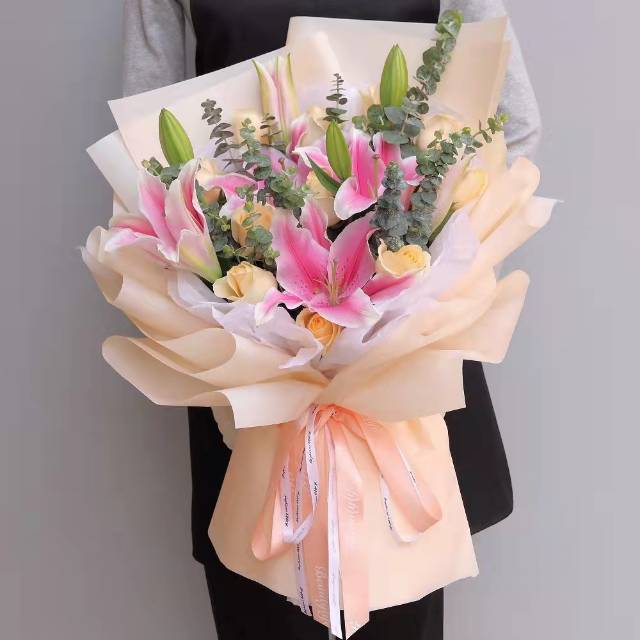 11朵香槟玫瑰粉色百合混搭花束 如图包装 |