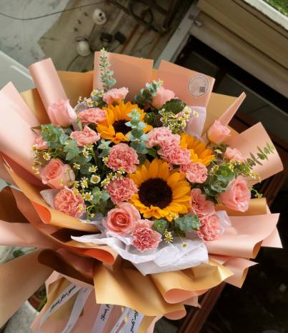 19朵粉康乃馨3朵向日葵混搭花束 ,如圖包 |
