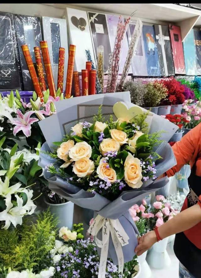 11支香槟玫瑰花束 ,上面放彩灯 |