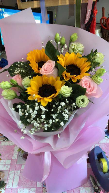 夜上海论坛11支粉玫瑰2支向日葵花束,如图 |