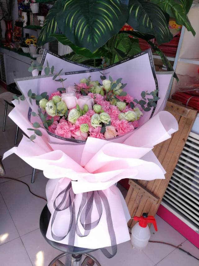 夜上海论坛康乃馨+粉玫瑰+满天星,白色网纱+粉色包装纸包装,搭配大气好看,花材新鲜,有卡片, |