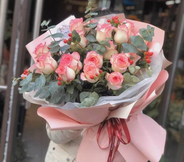夜上海论坛6朵粉玫瑰粉色蓝色满天星混搭花束 如图 |