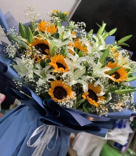 夜上海论坛5支多头白百合+5支向日葵 白色满天星花束,如图 |