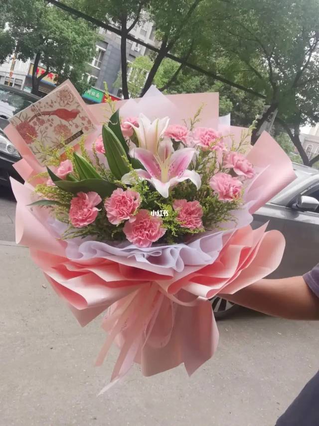 11朵粉色康乃馨加一支多头粉百合花束,如图包 |