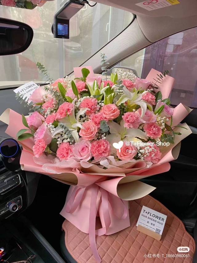 33支粉康乃馨粉玫瑰+3支多头白百合,如图 |