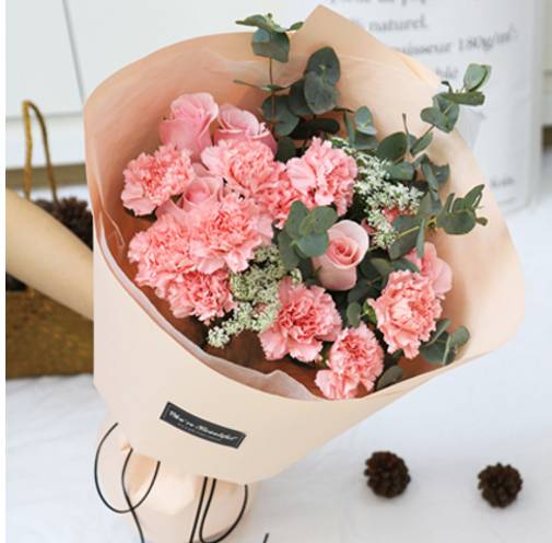 材料:优选10支粉色康乃馨,6支粉玫瑰,尤加利叶点缀! 包装:精美牛皮纸包装,丝带束扎 |