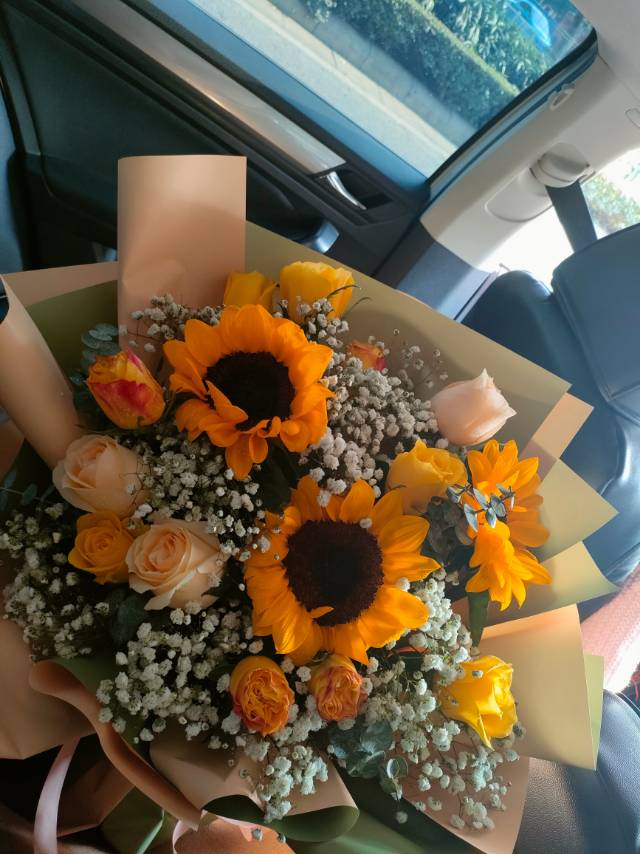 9朵玫瑰3朵向日葵配桔梗混搭花束 |