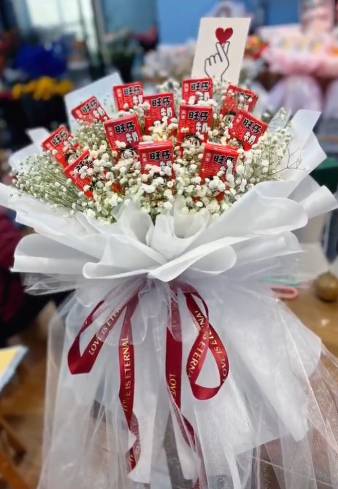 11瓶旺仔牛奶配满天星花束(图中牛奶换成旺仔的) |