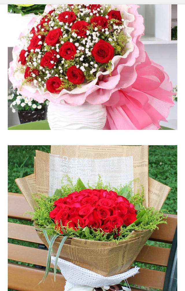 夜上海论坛33支红玫瑰2支多头白百合鲜花束 。红色包装纸 按图包