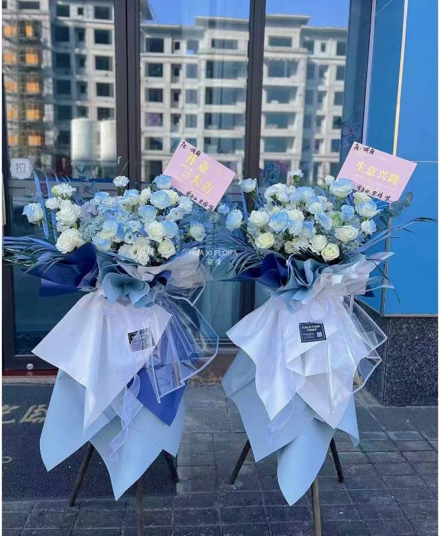 开业花篮一对,白色 蓝色调(图一的花,图二的包装纸)