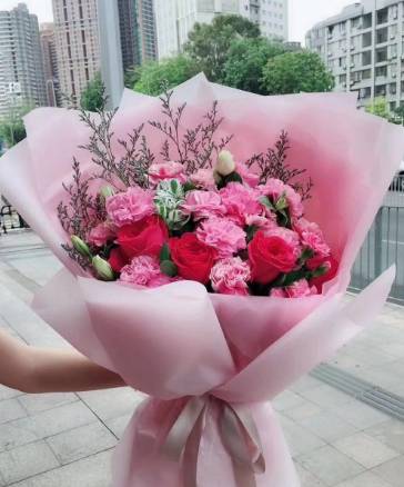 夜上海论坛11朵粉康乃馨4朵红玫瑰花束,花材新鲜,包装大气,如图 |