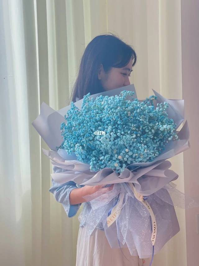 蓝色满天星鲜花束,另要二支多头粉百合。一支多头白百合。一个花瓶