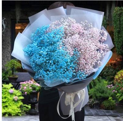 蓝色满天星 粉色满天星 里层雾面纸外层黑色包装纸 米色扎带 搭配丰满 包装做大一些