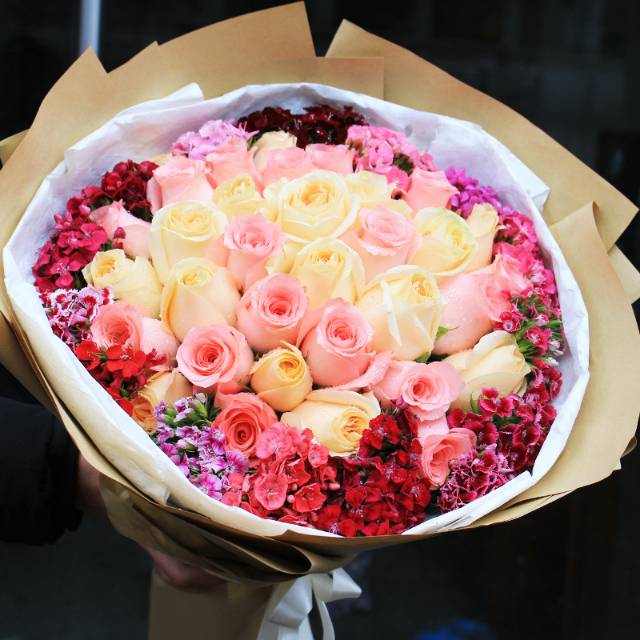 33朵混搭玫瑰鲜花花束 香槟+戴安娜玫瑰混搭 相思梅石竹梅搭配 外包装如图制作 7号晚上6点客人自取 |