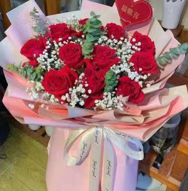 13朵粉玫瑰3支向日葵满天星鲜花束,如图包 |