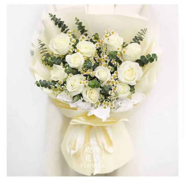 夜上海论坛11朵白玫瑰配洋甘菊尤加利花束 ,按图包 |