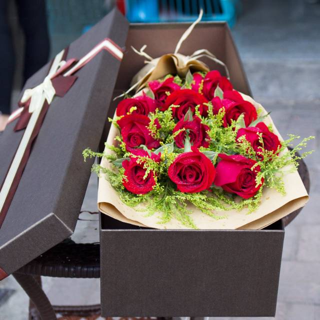 夜上海论坛11朵红玫瑰+黄英+咖啡色礼盒 +如图包装制作,保证新鲜度 |