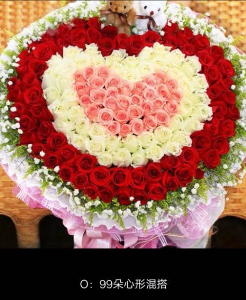 99朵混搭玫瑰心形花束(红玫瑰+雪山+戴安娜)+2熊+黄英满天星搭配丰满,如图插花泥制作,粉色包装 |