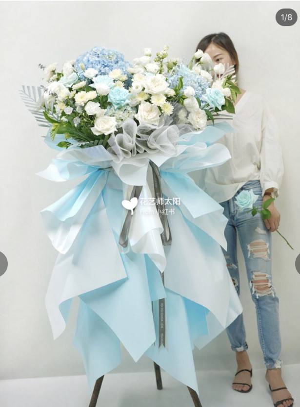 2个高档花篮:每个花材:2个淡蓝色绣球+30朵白玫瑰+白色雏菊+白色洋桔梗+尤加利+绿色配草,白纱,淡蓝色纸,白色雾面纸多层包。纸多包几层。银灰色大蝴蝶结,花要新鲜。做现来一定要大气。花材要饱满。制作好回图。 |