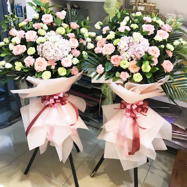 2个三角架花篮:每个花材:2个蓝绣+30朵玫瑰(戴安娜,苏醒)+3朵黄百合+3枝粉色金鱼草+绿色洋桔梗花+绿色配草,底下用粉色雾面纸多层包装。如图制作。花一定要新鲜。花材饱满,大气 |