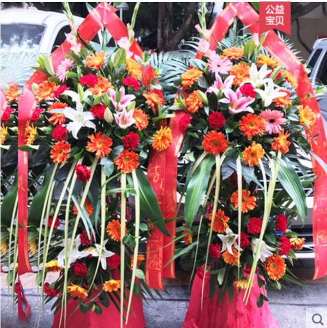 4个双层花篮:每个花材如下:50朵太阳花+8朵百合+3枝剑兰(或是富贵竹)+剑叶+巴西叶+栀子叶+散尾叶,搭配丰满,务必保证质量和新鲜度,如图效果丰满,看起来大气,以免客户投诉 |
