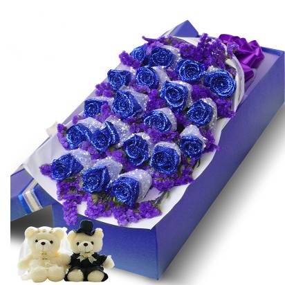 夜上海论坛19朵蓝色玫瑰 紫色勿忘我 白色包装紫色扎带 如图包装 2支小熊 蓝色礼盒