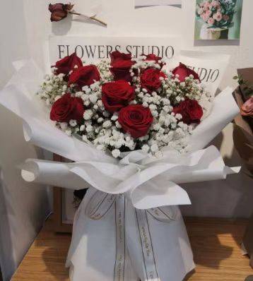 11朵红玫瑰加白星加彩灯鲜花束,如图包 |